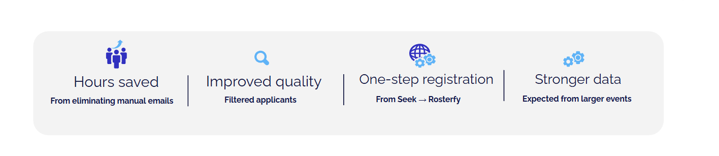 The Seek Volunteer/Rosterfy integration enabled candidates to apply directly through Seek Volunteer, automatically pushing applications into Rosterfy. This automation simplified the