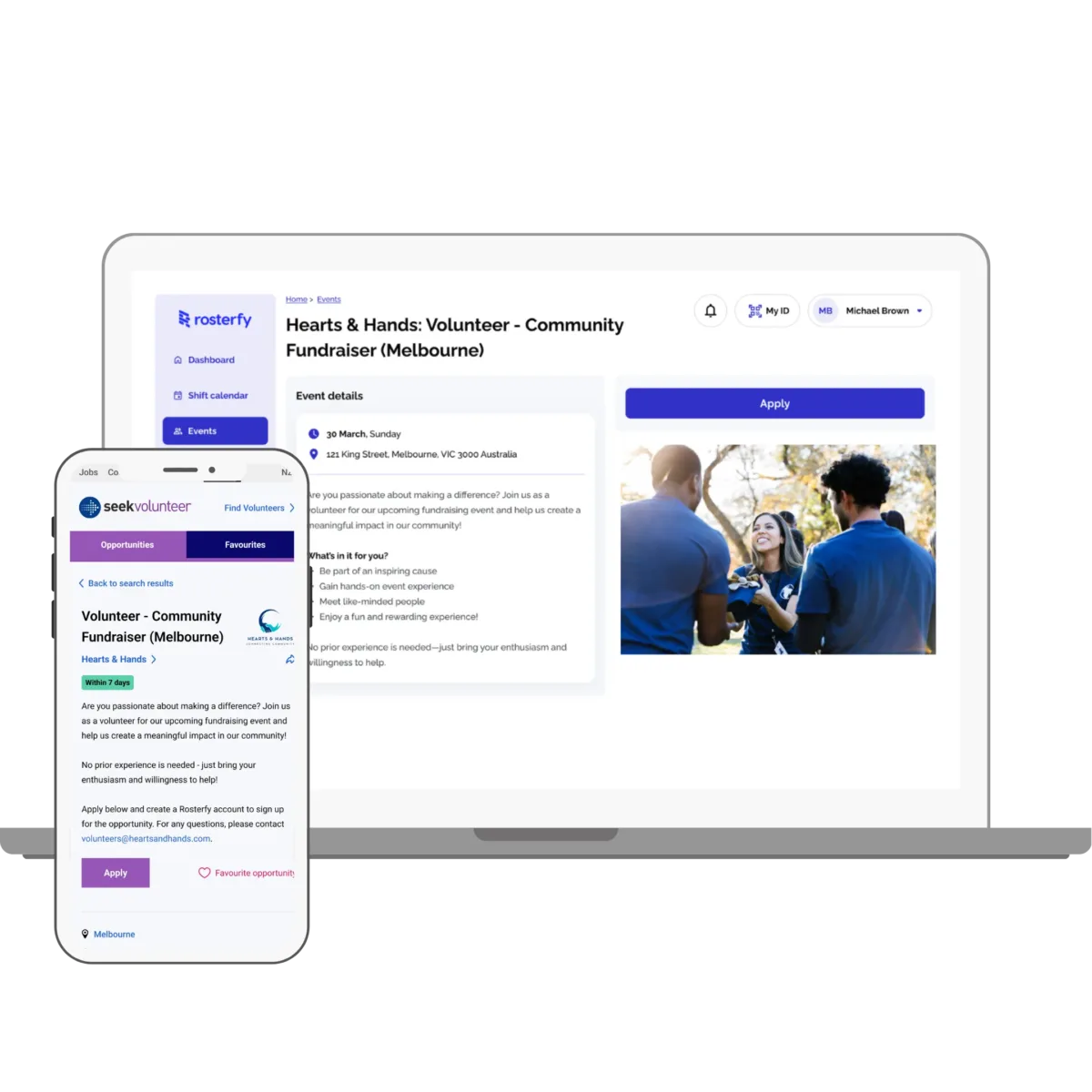 Volunteers can now apply for volunteer opportunities via SEEK Volunteer and complete their application with an organisation directly via Rosterfy.