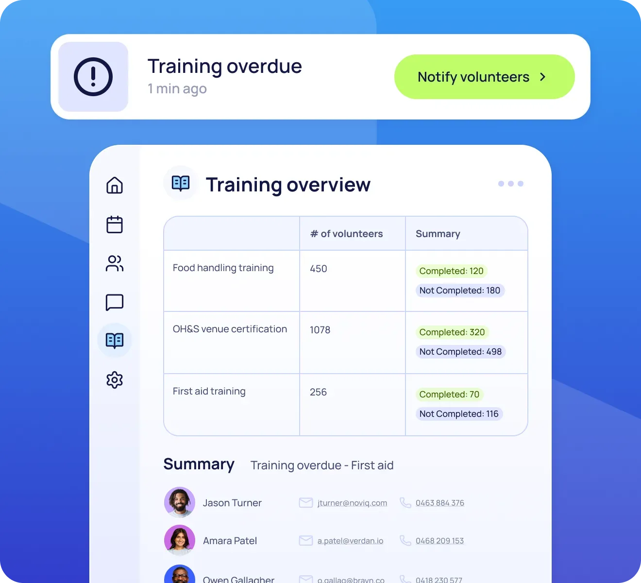 Guide volunteers through their training journey with automated emails, SMS, and in-portal notifications, ensuring nothing gets missed.