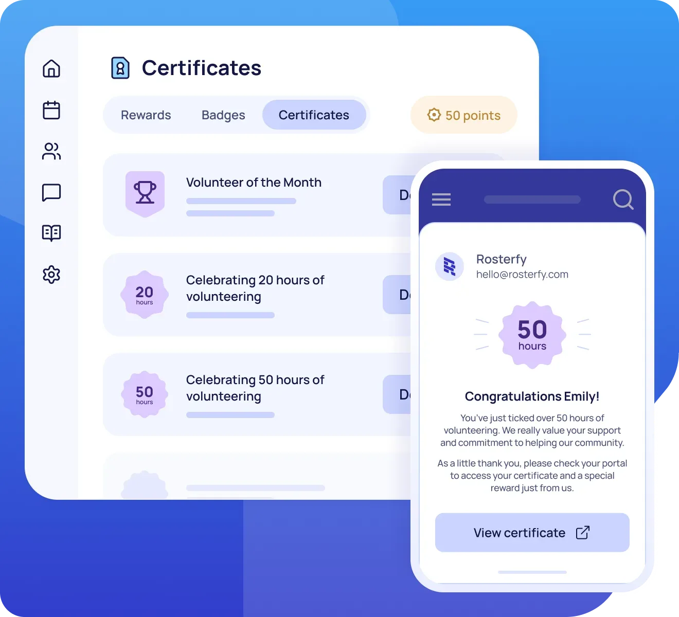 Whether it’s acknowledging milestones through e-badges and certificates, through to tangible rewards, Rosterfy makes it easy to show appreciation and keep your volunteers engaged.