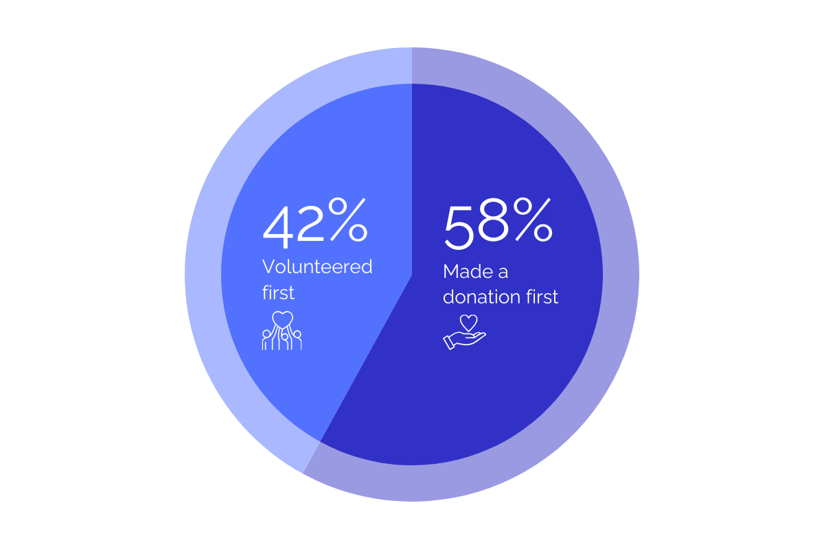 In a report by Fidelity Charitable they looked at the act that instigated support in a cause, either volunteering or donating to the cause. Although, only narrow the majority of people who have donated both time and money to a cause, began doing so by donating first.