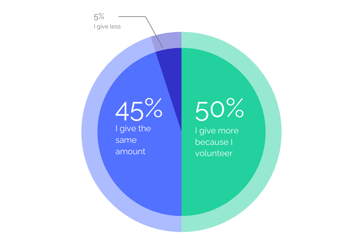In a survey from Fidelity Charitable titled: Time and Money the role of volunteering in Philanthropy they found that 87% of volunteer activities overlap with donating at various degrees from constantly donating whilst volunteering and occasionally donating.