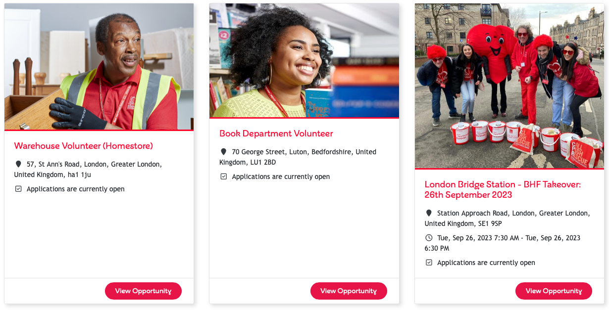 A term that often gets used in this particular sector is a ‘Digital Front Door’ for volunteers. It’s something that BHF understands very well. They have used Rosterfy to create an engaging portal displaying opportunities to volunteer at their store, the schedule they are needed and a clear outline of the role.