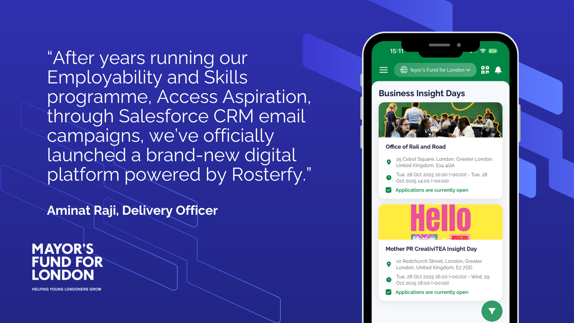 Rosterfy is delighted to welcome the Mayor’s Fund for London (MFL) to the Rosterfy community. This autumn, their flagship Access Aspiration Employability and Skills programme will officially go live on the Rosterfy platform – investing in a seamless, engaging experience that empowers young people on their journey to employment.