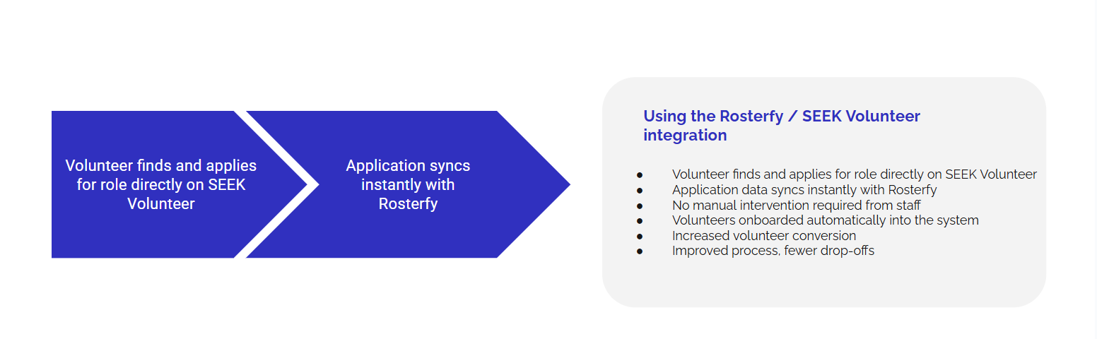 The Seek Volunteer/Rosterfy integration enabled candidates to apply directly through Seek Volunteer, automatically pushing applications into Rosterfy. This automation simplified the