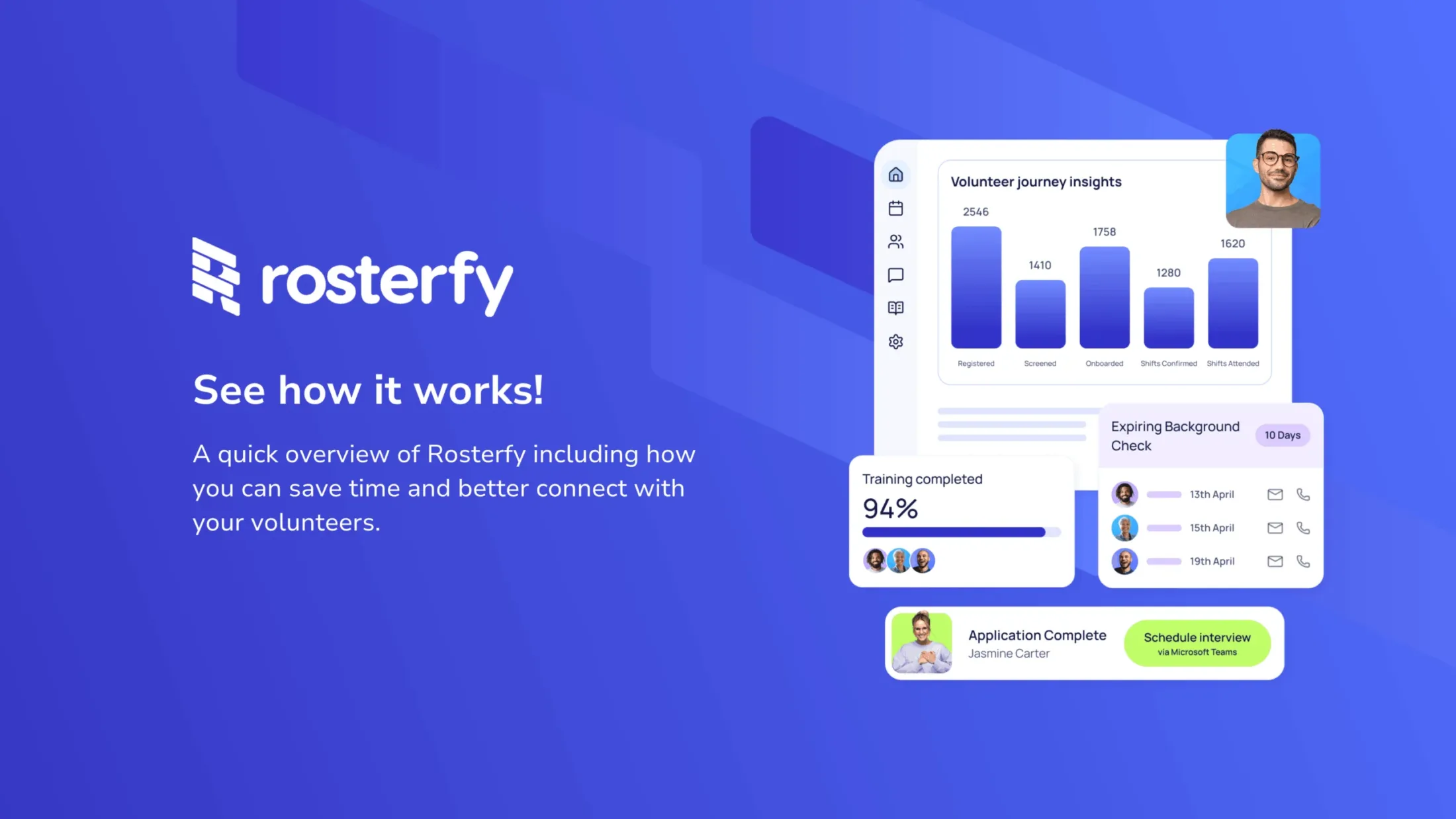 See how Rosterfy simplifies the way you recruit, manage, and engage your workforce. Take a quick guided tour with our Volunteer Management Specialists to discover how Rosterfy can help you better connect with your community.