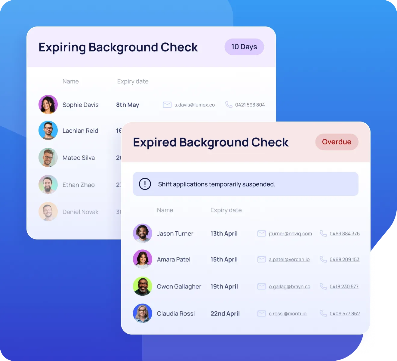 Stay compliant with automated alerts for expiring credentials, and use built-in automations to pause shift applications until required documentation is renewed and received via the platform.