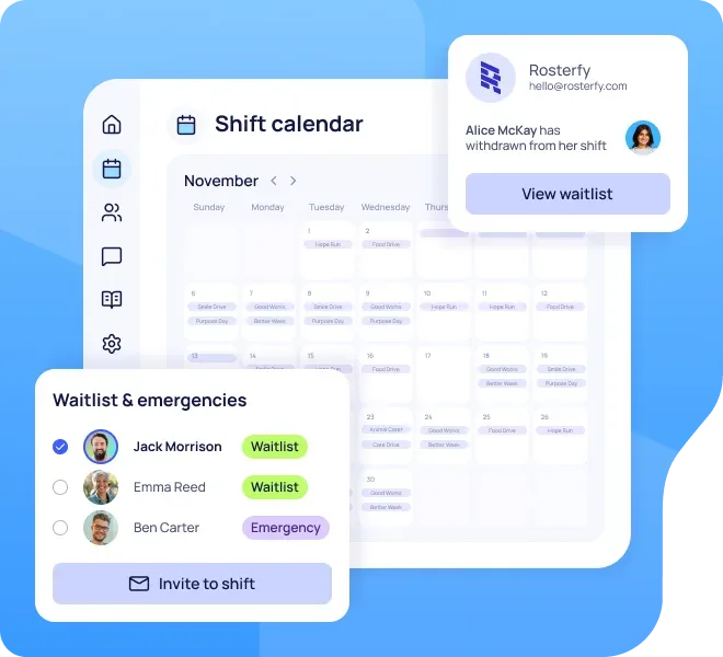 Rosterfy keeps your roster running smoothly, even when volunteers can’t make it. Create automated waitlists for full shifts or emergency lists for no-shows to ensure every role is covered without the scramble.