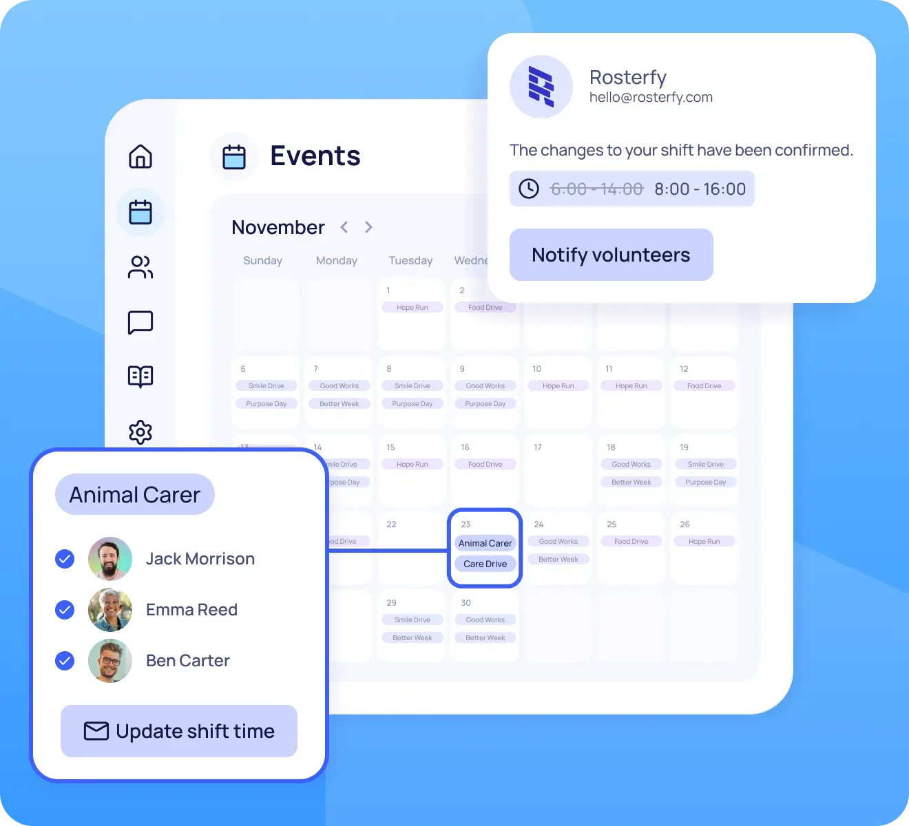 From onboarding and scheduling to compliance and reporting, Rosterfy automates repetitive tasks, saving your team valuable time while delivering a seamless, personalised experience for every volunteer.